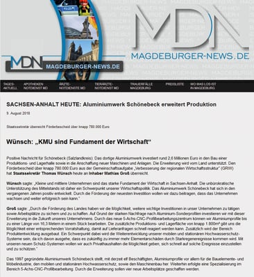 Das 1997 gegründete Aluminiumwerk Schönebeck stellt, mit derzeit elf Beschäftigten, Aluminiumprofile vor allem für die Bauelemente- und Möbelindustrie, den mobilen und stationären Hochwasserschutz, sowie den Maschinenbau her. Weiterhin erfolgte eine Spezialisierung im Bereich 5-Achs-CNC-Profilbearbeitung. Durch die Erweiterung sollen vier neue Arbeitsplätze geschaffen werden.